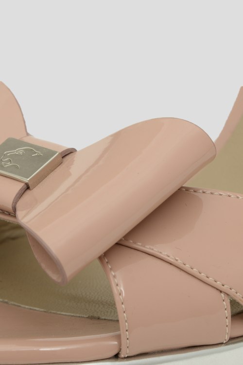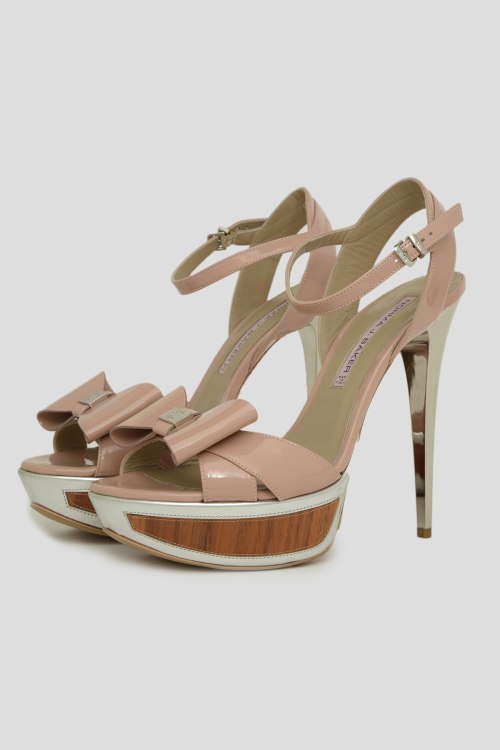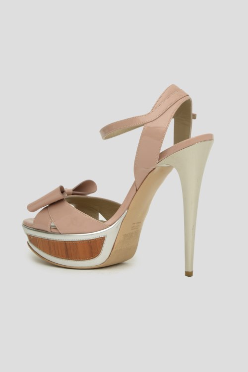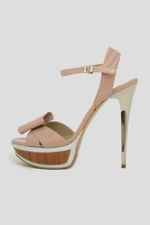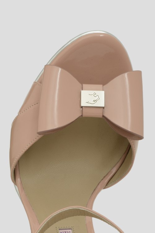 Детали: Босоножки светло-розового цвета из натуральной лакированной кожи. Высокая платформа, тонкий каблук, застежка на щиколотке. Дополнены бантом