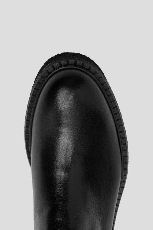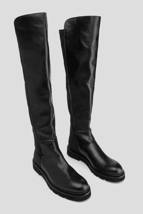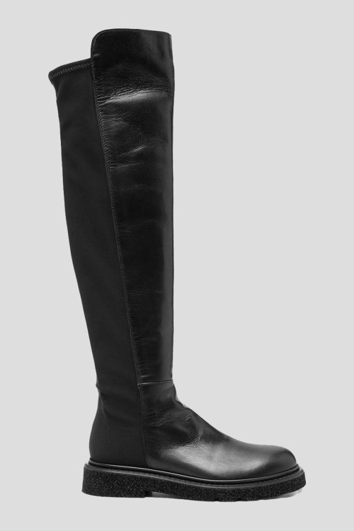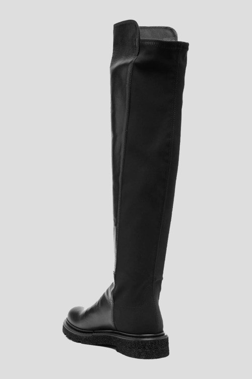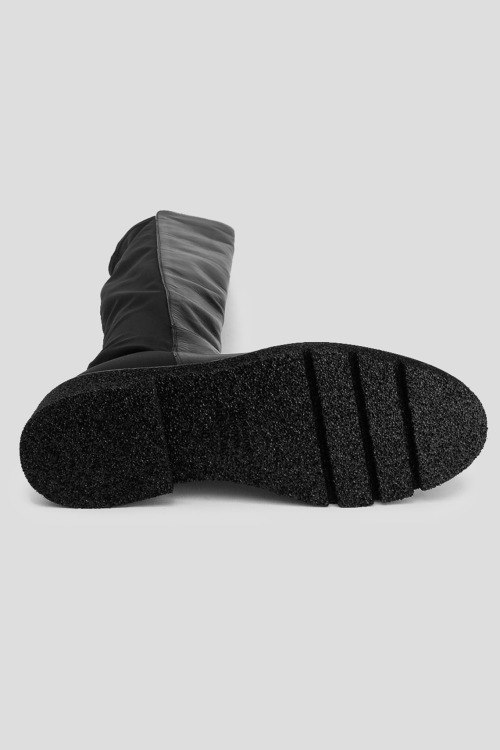 Детали: Женские черные ботфорты из кожи и текстиля от Guglielmo Rotta (Гульельмо Ротта). Модель без застежки, комбинация материалов, облегающий фасон, закругленный носок