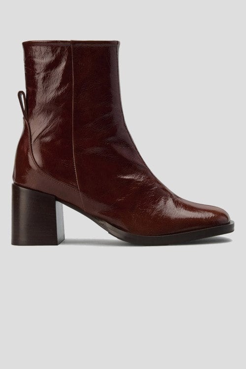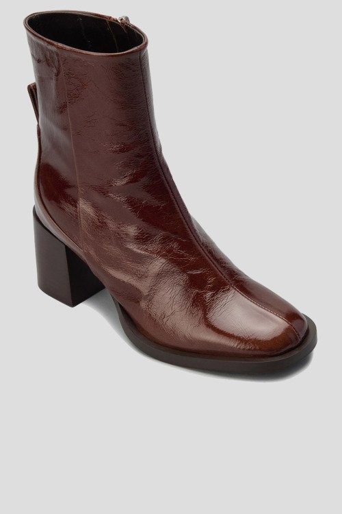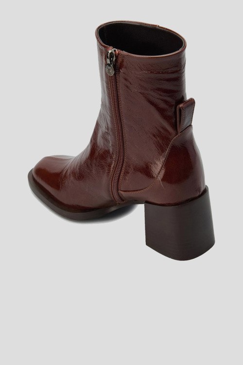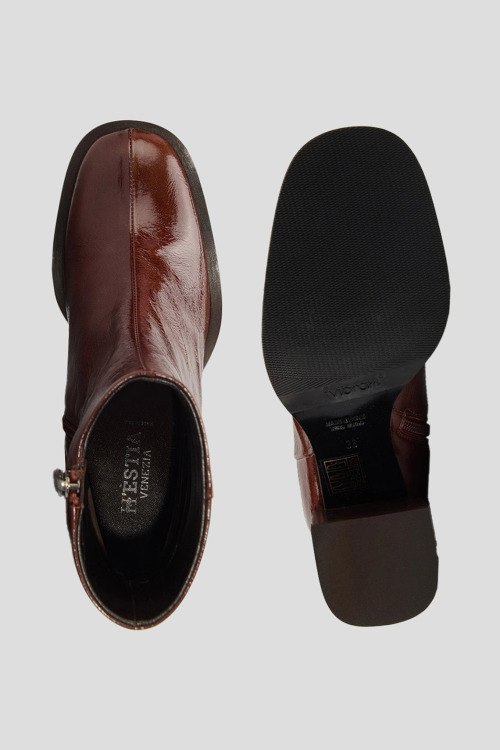 Детали: Женские бордовые лаковые ботильоны от Hestia Venezia (Эстиа Венеция). Глянцевый эффект, застежка-молния сбоку, закругленный носок, кожаная стелька. Высота каблука: 6.5 см, высота голенища: 15 см, объем голенища: 24 см. Замеры для: 36 размера