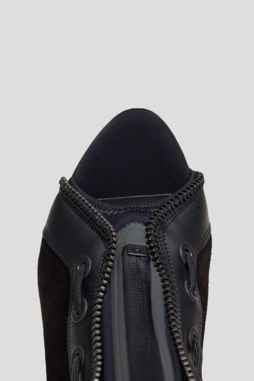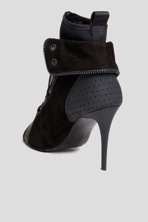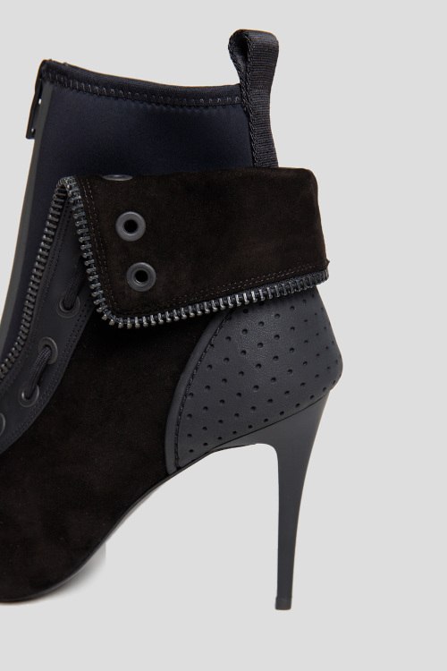 Женские черные ботильоны из кожи и замши от Alexander Wang (Александр Ванг). Комбинация материалов, застежка-молния спереди, серебристая фурнитура, петля для подтягивания сзади, отворот сверху, открытый миндалевидный носок. Модель на узкую стопу. Маломерят на размер. Высота каблука 10 см. Замеры: на размер 36, стелька 22,5 см, голенище 9 см; на размер 37, стелька 23,5 см, голенище 9 см; на размер 38, стелька 24 см, голенище 9 см; на размер 39, стелька 24,5 см, голенище 10 см; на размер 41, стелька 26 см, голенище 10 см
