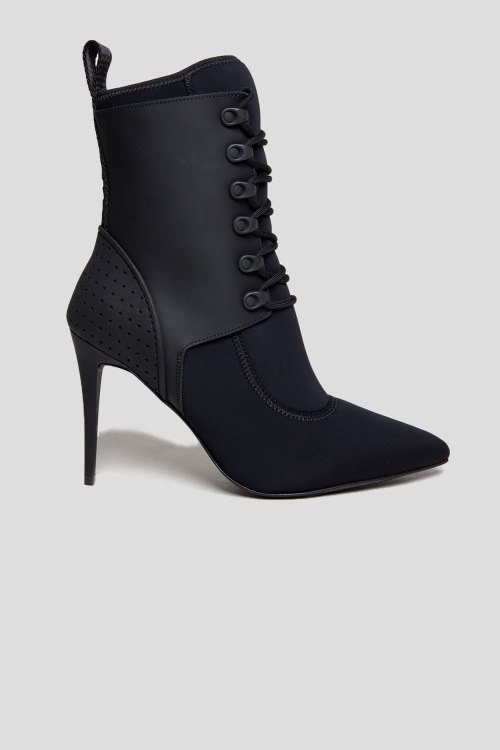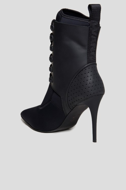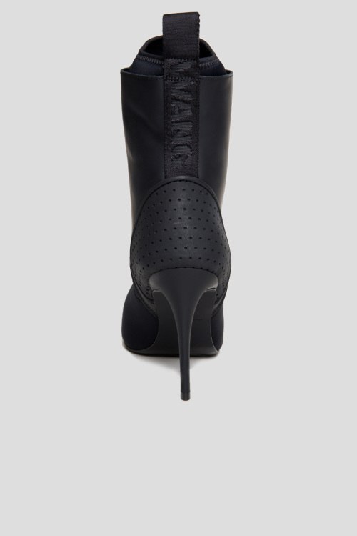 Женские черные ботильоны из кожи и неопрена от Alexander Wang (Александр Ванг). Комбинация материалов, шнуровка спереди, тесьма с логотипом сзади, петля для подтягивания, уплотненный кожаный задник, узкий носок. Данная модель расчитана на узкий и средний подъем. На высокий подъем маломерит на один размер. Высота каблука 10 см. Замеры: на размер 39, стелька 24,5 см, голенище 12 см; на размер 41, стелька 26 см, голенище 12 см