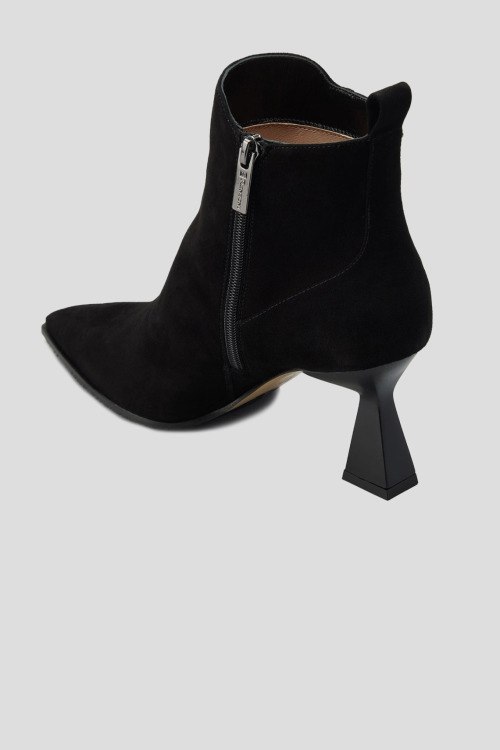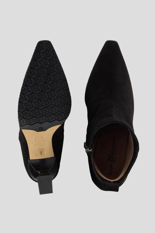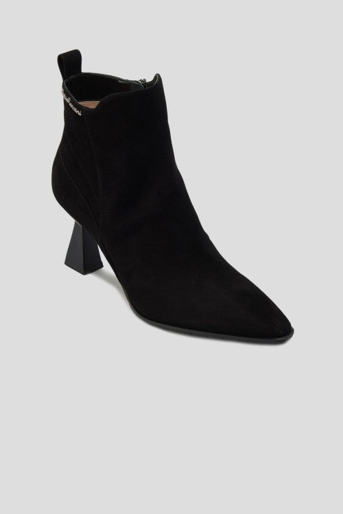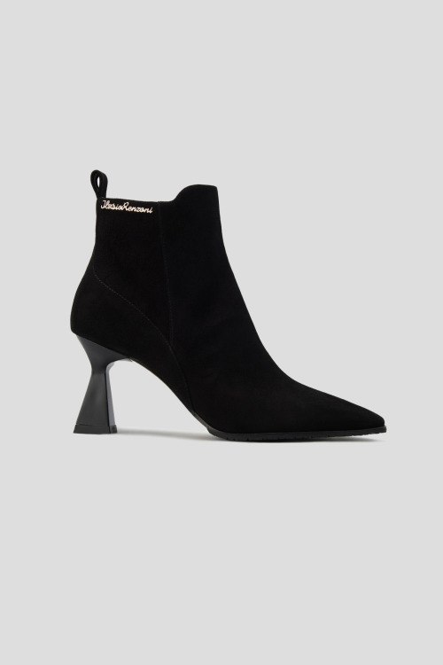 Детали: Женские черные замшевые ботильоны от Ilasio Renzoni (Иласио Рензони). Значок с логотипом, застежка-молния сбоку, петля для подтягивания сзади, зауженный носок. Высота каблука: 8 см, высота голенища: 11 см