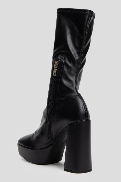 Детали: Черные ботильоны из экокожи от Love Moschino (Лав Москино). Носочный дизайн, принт с логотипом, застежка-молния сбоку, высокий массивный каблук, квадратный носок. Высота каблука: 12.5 см, платформа: 3.5 см, высота голенища: 26 см, объем голенища: 26 см. Замеры указаны для 37 размера