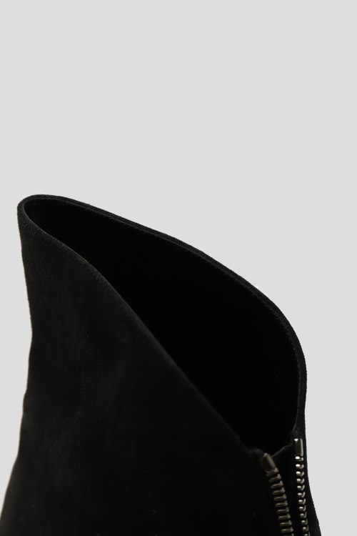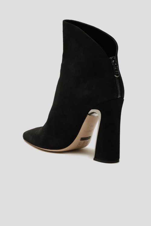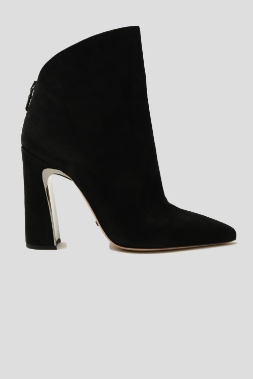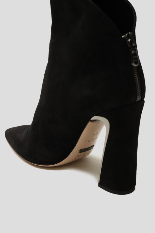 Детали: Женские черные ботильоны из натуральной замши от Sebastian (Себастиан). Острый носок, сзади застежка-молния серебристого цвета, высокий устойчивый каблук с золотистой вставкой, стелька из натуральной кожи. Измерения: высота каблука: 11 см
