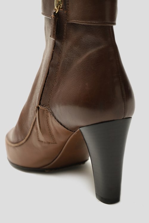 Детали: Женские коричневые ботильоны из натуральной кожи от Pollini (Поллини). Миндалевидный носок, сбоку застежка на молнию, высокий каблук. Измерения: высота каблука: 8,5 см, высота голенища: 11 см