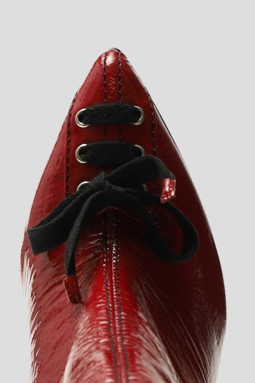 Детали: Женские красные ботильоны из лакированной кожи от Casadei (Касадей). Острый носок, декорированный шнуровкой, сбоку застежка на молнию, высокий каблук-шпилька. Измерения: высота каблука: 11 см, высота голенища: 17 см