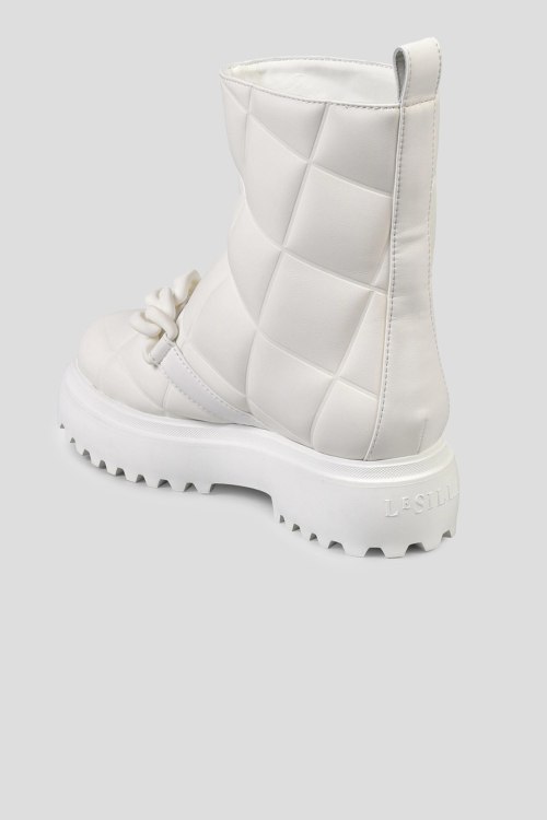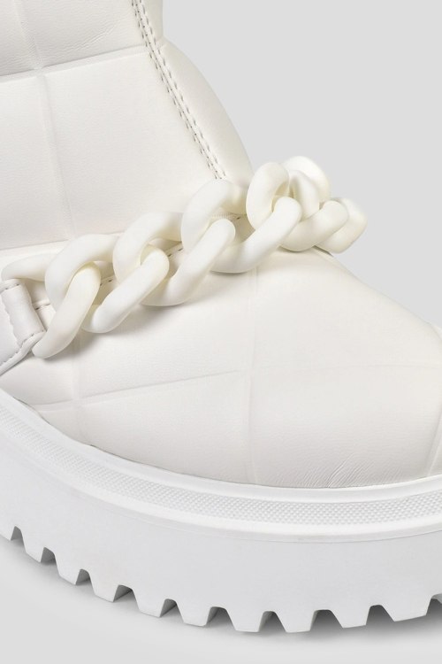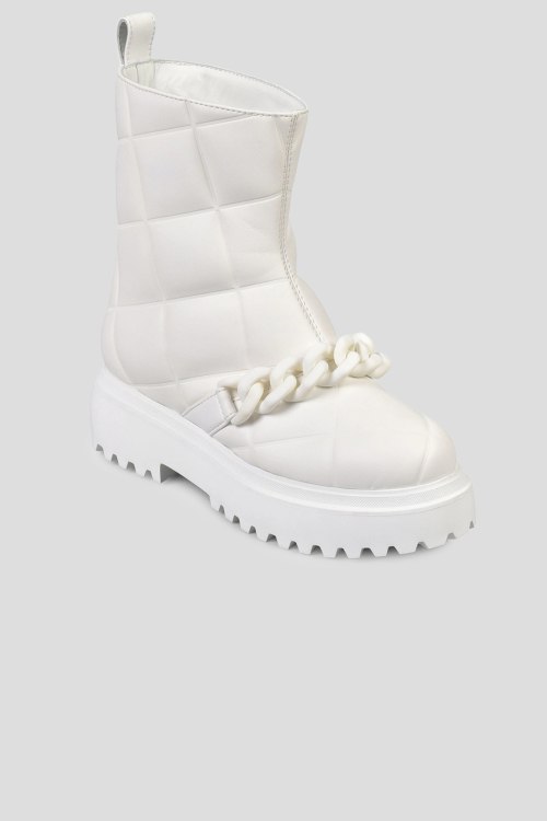 Женские белые ботинки из экокожи от Le Silla (Ле Силла). Модель из гладкой кожи, без застежки, стеганый дизайн, декор цепью, петля для подтягивания сзади, закругленный носок, внутри на меху. Подошва: 5 см, высота голенища: 19 см