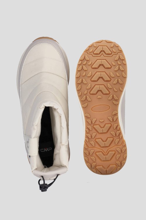Женские бежевые дутые ботинки Zoy Wmn Snow Boots Wp от CMP (СМП). Стеганый дизайн, без застежки, водонепроницаемая модель, по верху изделия утяжка, текстильная подкладка, резиновая рельефная подошва, логотип бренда, мембрана ClimaProtect