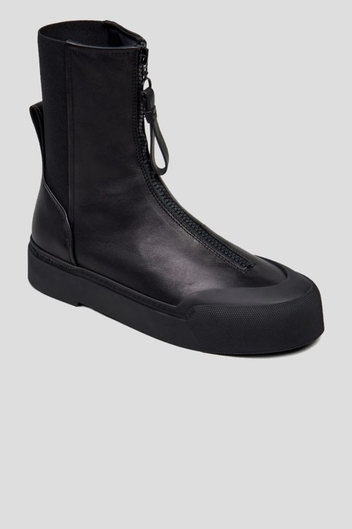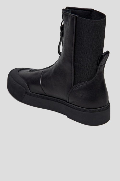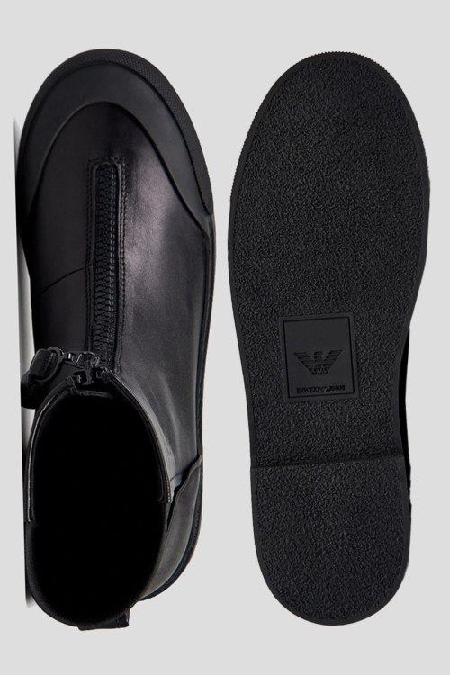 Детали: Женские черные ботинки из кожи и текстиля от Emporio Armani (Эмпорио Армани). Модель из гладкой кожи, эластичная вставка, застежка-молния спереди, петля для подтягивания сзади, закругленный носок. Высота подошвы: 3.5 см