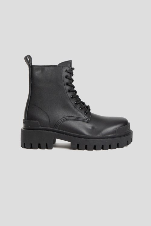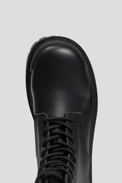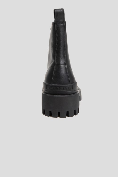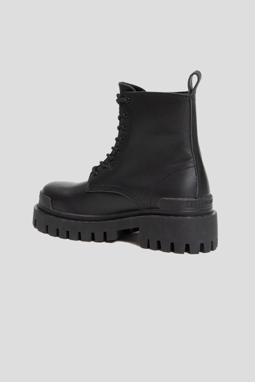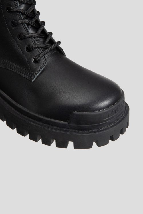 Детали: Женские черные кожаные ботинки Strike от Balenciaga (Баленсиага). Модель из гладкой кожи, классическая шнуровка, петля для подтягивания сзади, логотип на пятке и на носке, массивная подошва. Комплектация: коробка, пыльник, пакет