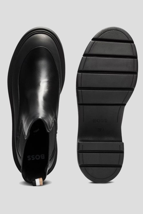 Детали: Женские черные кожаные челси от Hugo Boss (Хуго Босс). Модель из гладкой кожи, эластичные резинки по бокам, петля для подтягивания сзади, закругленный носок, массивная подошва