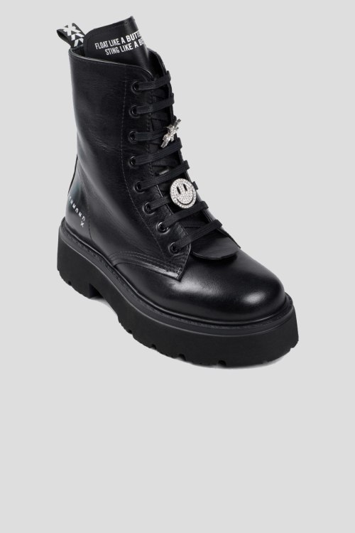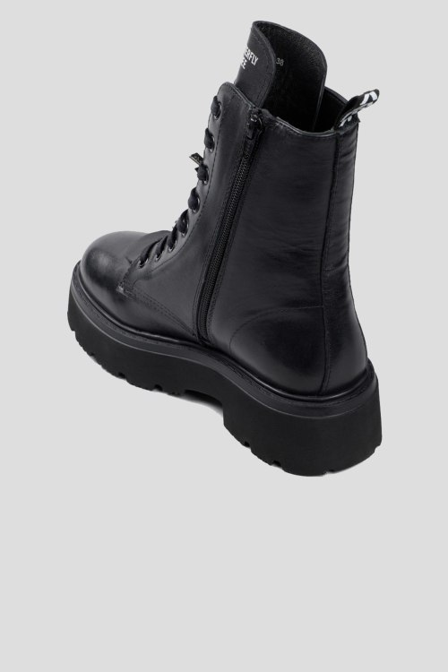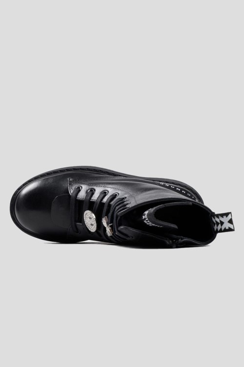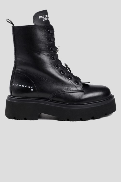 Детали: Женские черные кожаные ботинки от John Richmond (Джон Ричмонд). Модель из гладкой кожи, принт с логотипом, надпись на язычке, классическая шнуровка, застежка-молния сбоку, петля для подтягивания сзади, закругленный носок, кожаная стелька. Высота каблука: 4.5 см, высота подошвы: 3.5 см, высота голенища: 17 см