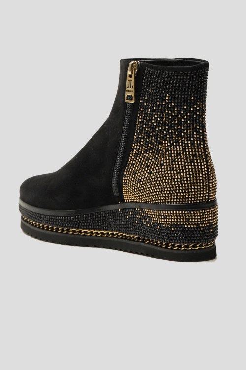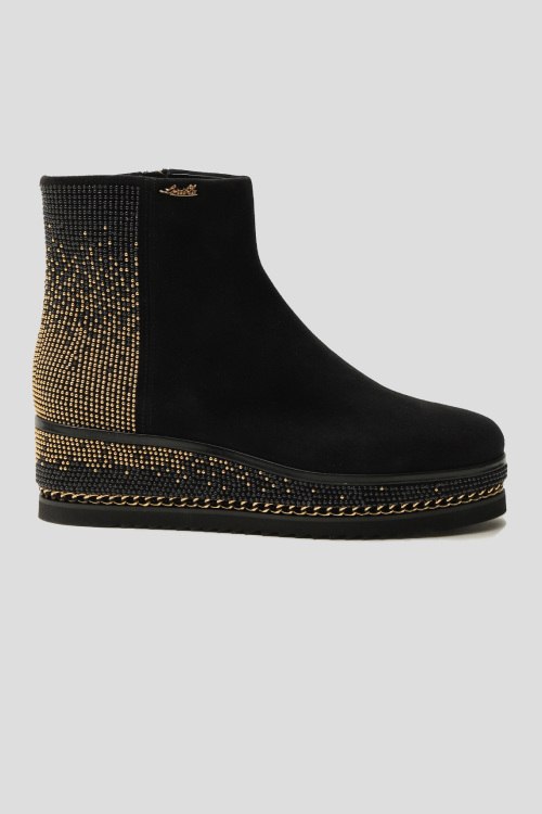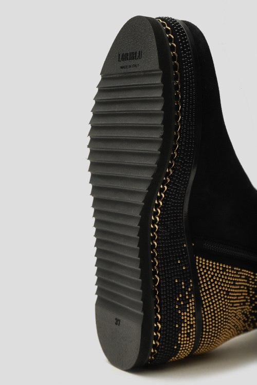Детали: Женские черные ботинки из натуральной замши от Loriblu (Лориблу). Миндалевидный носок, высокая рельефная подошва, сбоку застежка на молнию, декорированы золотистыми и черными кристаллами. Измерения: высота подошвы: 5 см