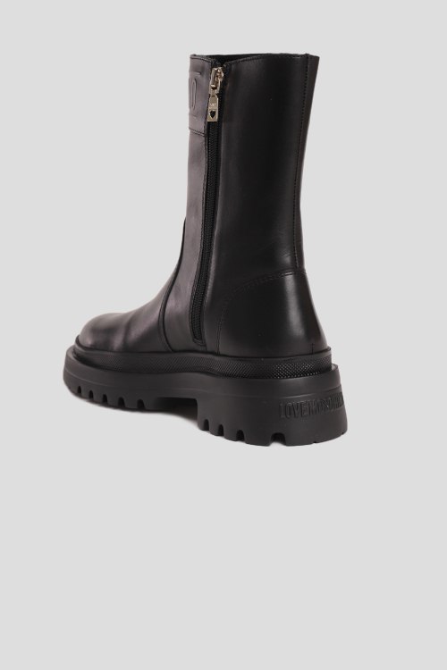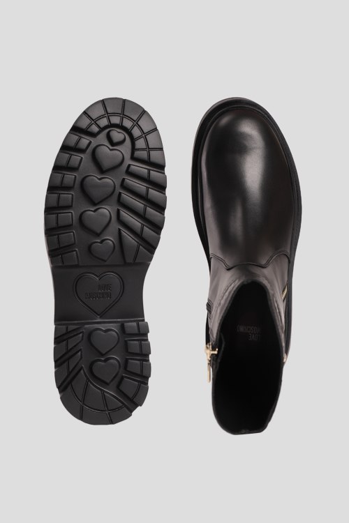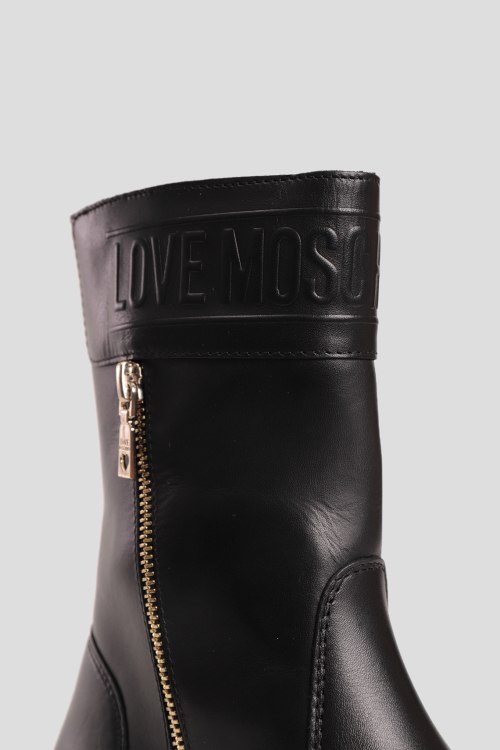 Детали: Женские черные кожаные ботинки от Moschino (Москино). Модель из гладкой кожи, тиснение логотипа, застежка-молния сбоку, закругленный носок., стелька из экокожи. Высота каблука: 5.5 см, подошва: 3.5 см