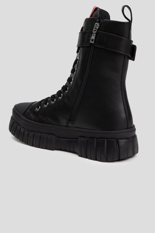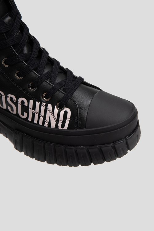 Детали: Женские черные кожаные ботинки от Love Moschino (Лав Москино). Модель из гладкой кожи, принт с логотипом, классическая шнуровка, застежка-молния сбоку, застежка на пряжку сбоку, петля для подтягивания сзади, закругленный носок. Высота каблука: 5 см, платформа: 4.5 см, высота голенища: 16.5 см