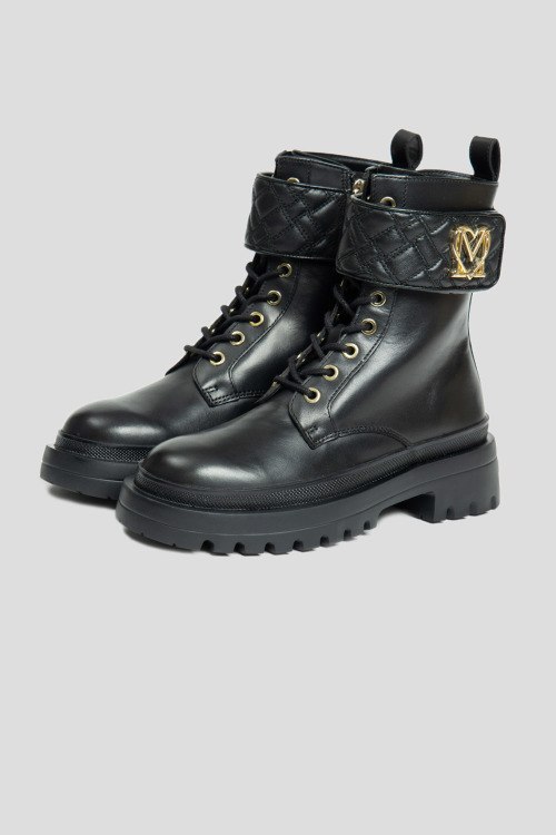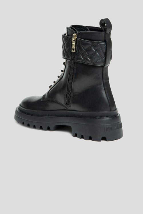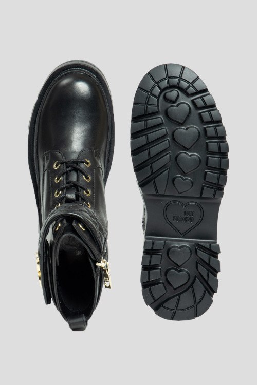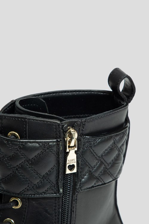 Детали: Женские черные кожаные ботинки от Love Moschino (Лав Москино). Модель из гладкой кожи, золотистый логотип сбоку, классическая шнуровка, застежка-молния сбоку, петля для подтягивания сзади, закругленный носок. Высота каблука: 5.5 см, платформа: 4 см, высота голенища: 15 см