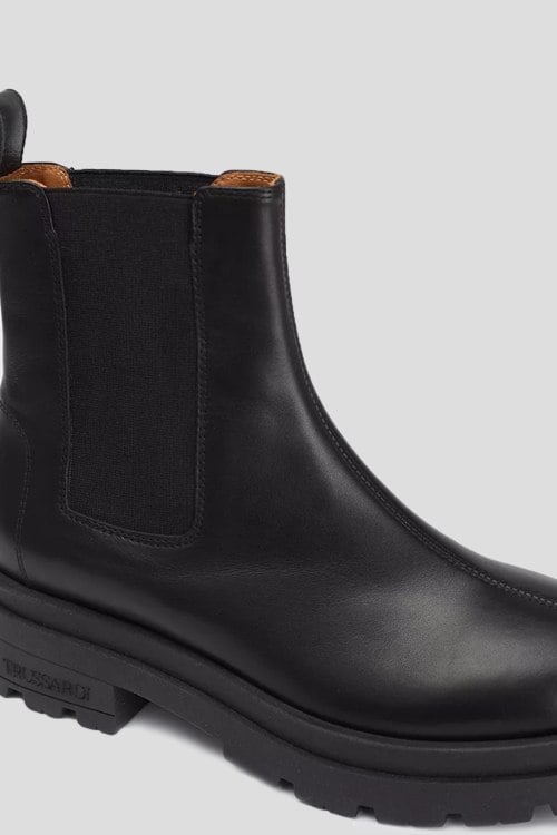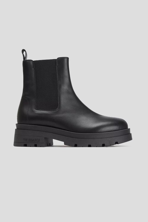Детали: Женские черные кожаные челси от Trussardi (Труссарди). Модель из гладкой кожи, эластичные вставки по бокам, петля для подтягивания сзади, закругленный носок, широкий каблук