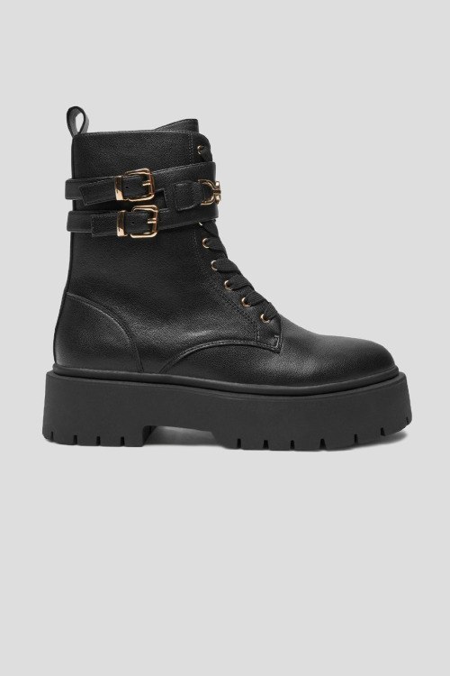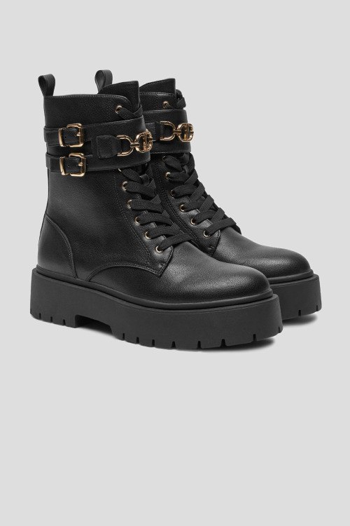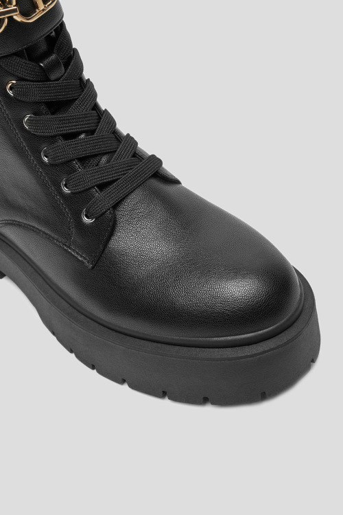 Детали: Женские черные ботинки из экокожи от TWINSET (Твинсет). Закругленный носок, спереди шнуровка, сбоку застежка на молнию, петля для подтягивания, декорирован ремешком с металлической фурнитурой, тракторная подошва, кожаная подкладка, без утеплителя