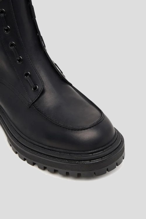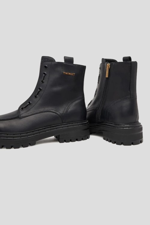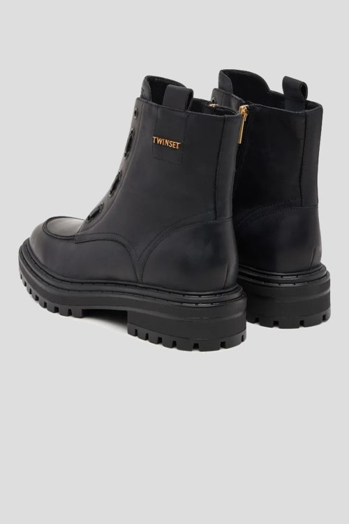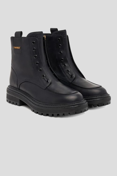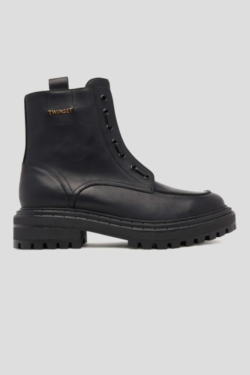 Детали: Женские черные кожаные ботинки от TWINSET (Твинсет). Модель из гладкой кожи, значок логотипа, застежка-молния сбоку, закругленный носок, тракторная подошва