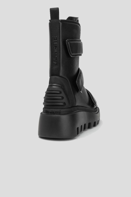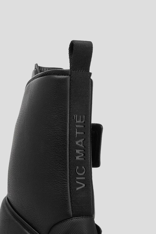 Детали: Женские черные ботинки из натуральной кожи от Vic Matie (Вик Матие). Квадратный носок, спереди застежка на липучки, брендированная петля, массивная тракторная подошва