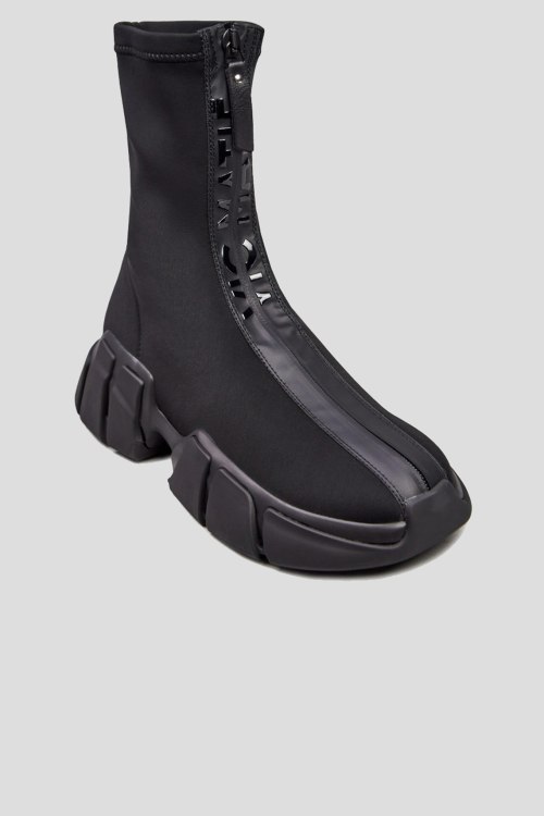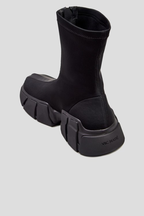 Детали: Женские черные стрейчевые ботинки от Vic Matie (Вик Матие). Носочный дизайн, застежка-молния спереди, закругленный носок, массивная подошва, кожаная стелька. Высота каблука: 4 см, высота подошвы: 4 см, высота голенища: 18 см