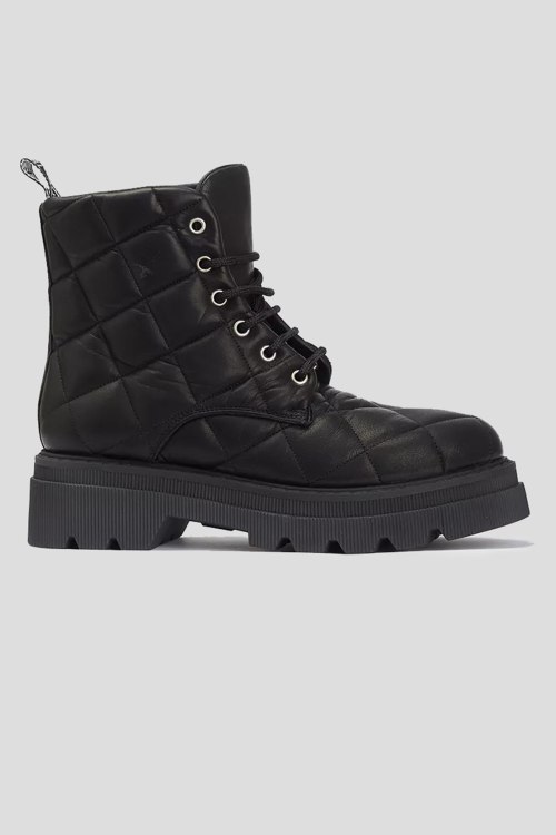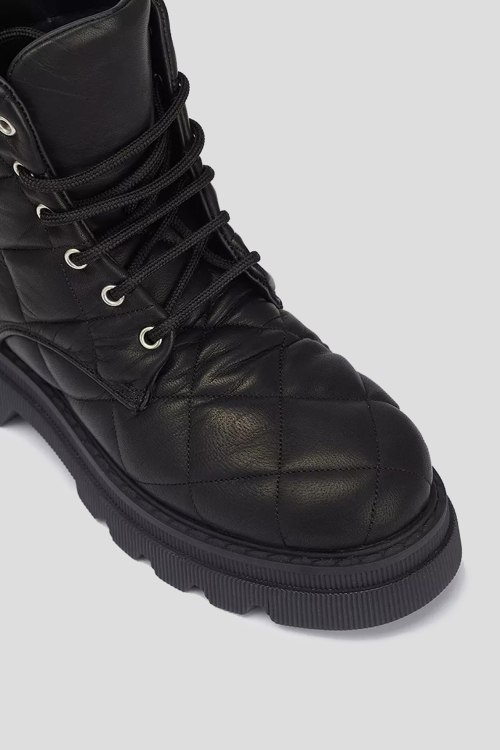 Детали: Женские черные кожаные ботинки от Voile Blanche (Вуаль Бланш). Модель из гладкой кожи, стеганый дизайн, классическая шнуровка, петля для подтягивания сзади, закругленный носок, тракторная подошва