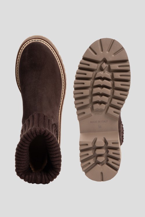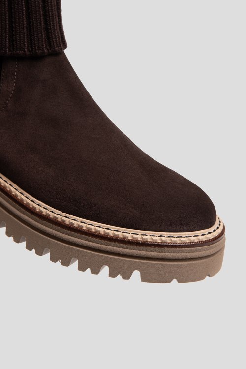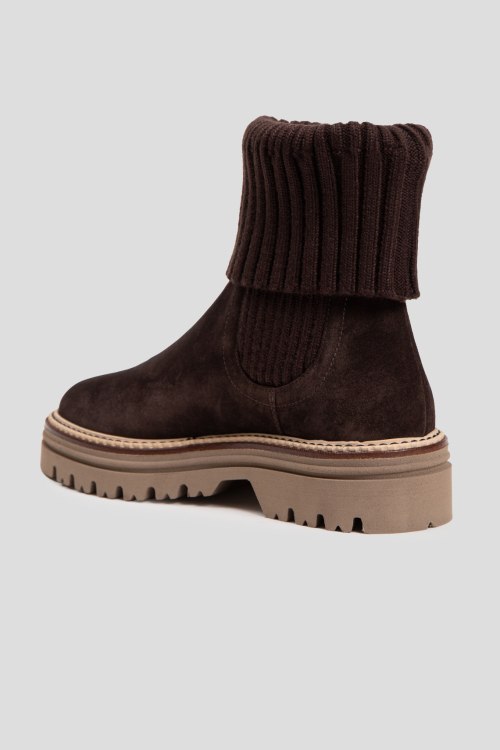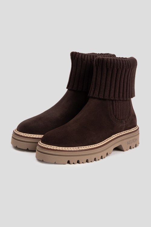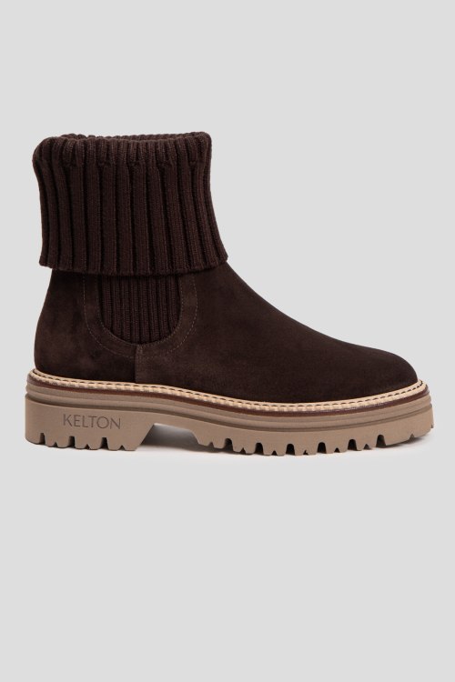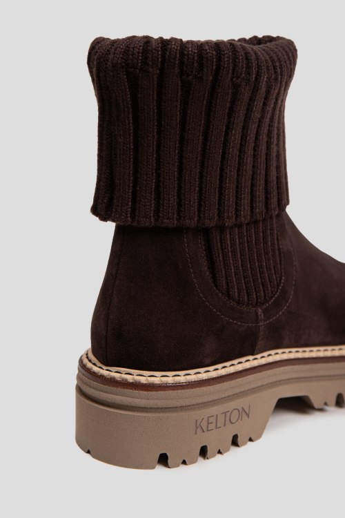 Детали: Женские темно-коричневые ботинки из замши и текстиля от Kelton (Кельтон). Комбинация материалов, носочный верх с отворотом, закругленный носок, кожаная стелька. Высота каблука: 4.5 см, подошва: 3.5 см, высота голенища: 15 см. Замеры указаны для: 38 размера