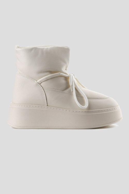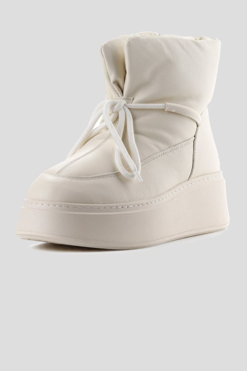 Женские белые сапоги из натуральной кожи от Le Berdes (Ле Бердес). Закругленный носок, стеганый дизайн, спереди шнуровка, массивная подошва, модель утепленная мехом