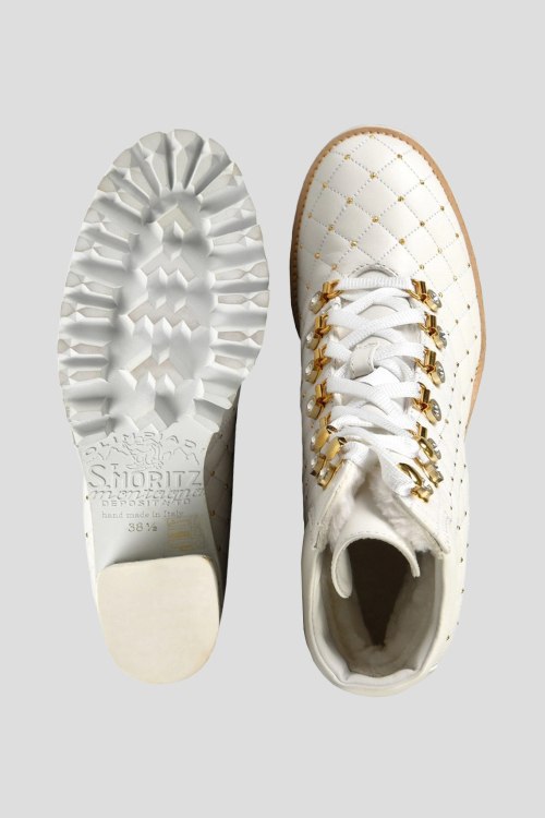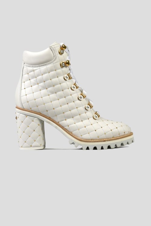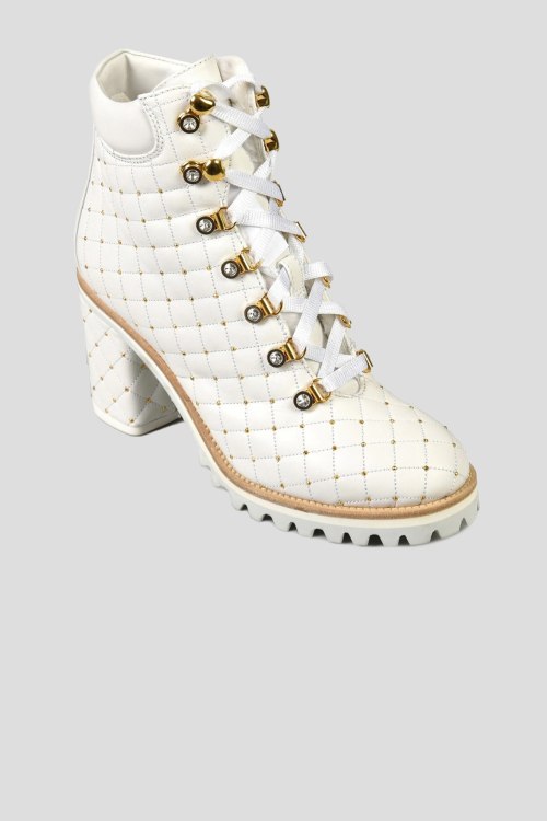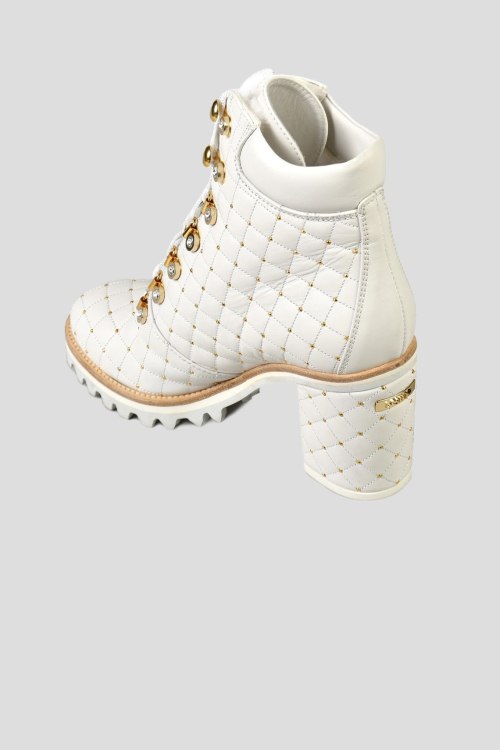 Детали: Женские белые кожаные ботильоны на меху St. Moritz от Le Silla (Ле Силла). Модель из гладкой кожи, декор золотистыми заклепками, классическая шнуровка, закругленный носок, широкий каблук, внутри на меху. Высота каблука: 8 см, высота голенища: 11 см