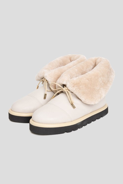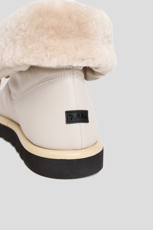 Женские ботинки молочного оттенка из натуральной кожи от 7AM (Севен эй эм). Стеганый дизайн, закругленный носок, шнуровка в тон изделия, отворот на щиколотке, утепленная модель натуральным мехом, резиновая рельефная подошва черного цвета, патч-лого на заднике