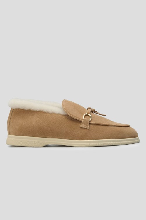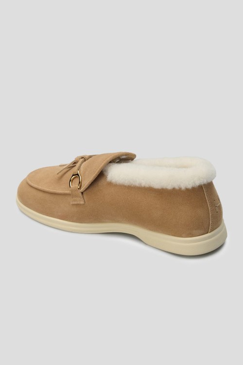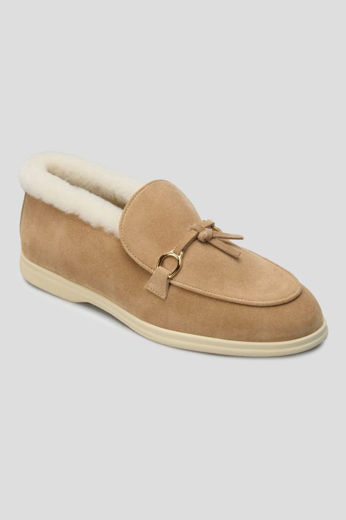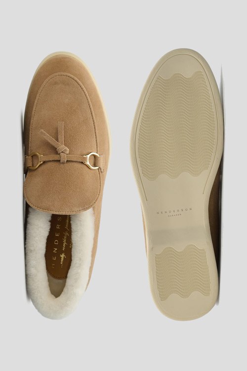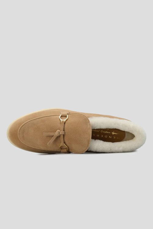 Детали: Женские бежевые замшевые лоферы на меху от Henderson Baracco (Хендерсон Баракко). Золотистая фурнитура, меховая отделка, миндалевидный носок, внутри на меху