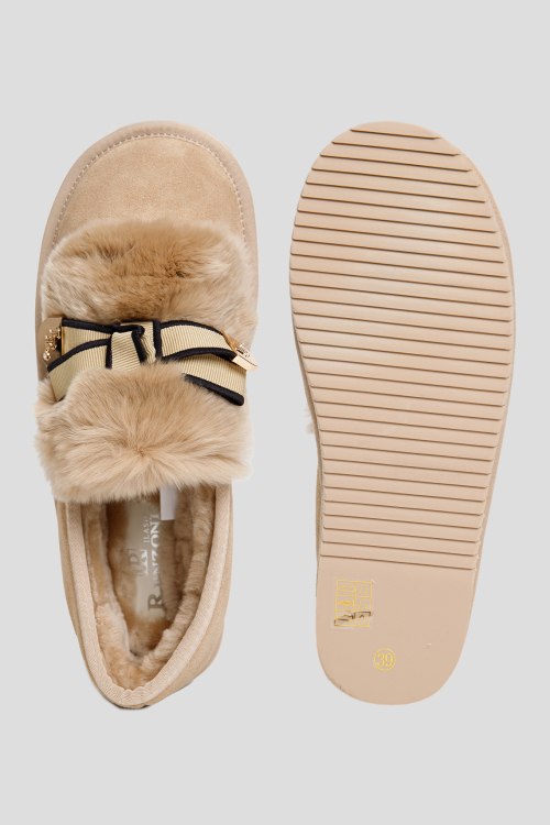Детали: Женские бежевые замшевые слипоны на меху от Ilasio Renzoni (Иласио Рензони). Отделка мехом кролика, декор золотистой фурнитурой, без застежки, закругленный носок, внутри на меху