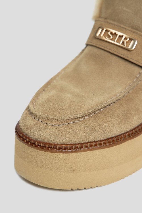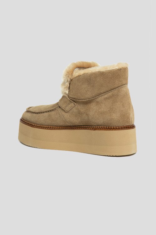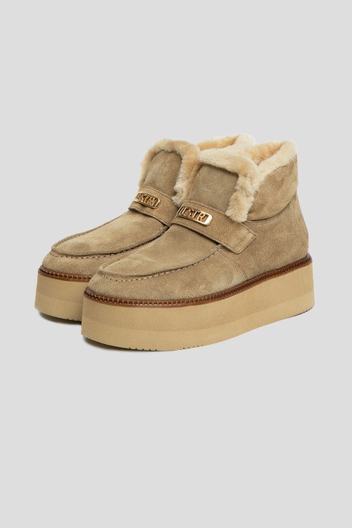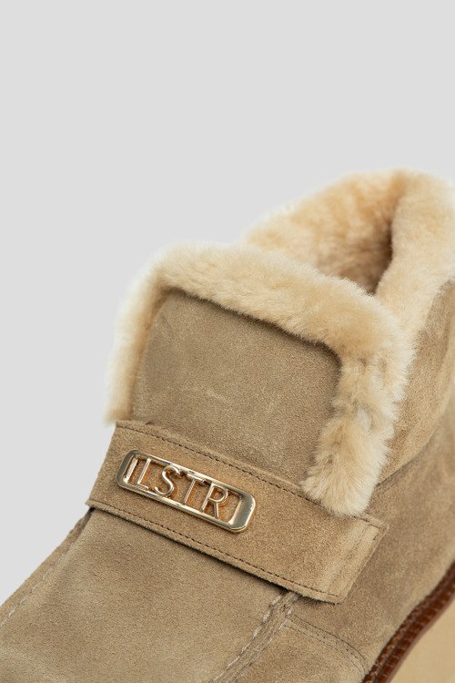 Детали: Женские бежевые ботинки из натуральной замши от L'Estrosa (Лестроса). Закругленный носок, без застежки, толстая подошва, металлическая пряжка золотистого цвета, модель утепленная натуральным мехом