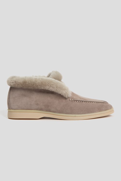 Детали: Женские бежевые дезерты из натуральной замши от Loro Piana (Лоро Пьяна). Миндалевидный носок, безе застежки, модель утепленная модель мехом