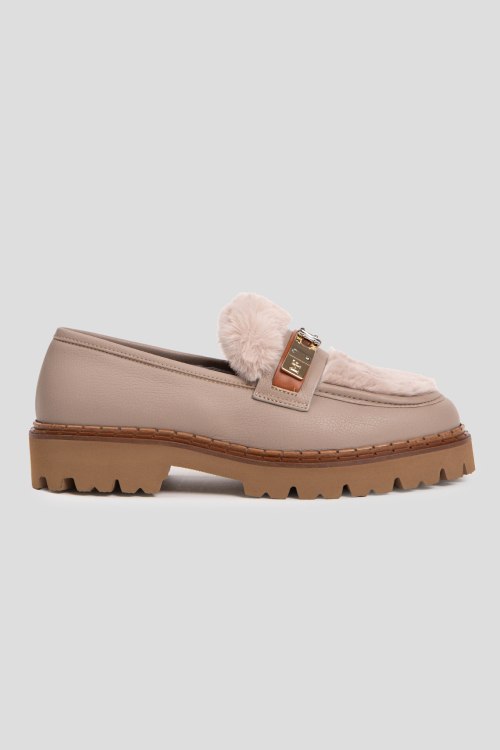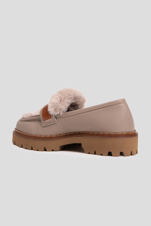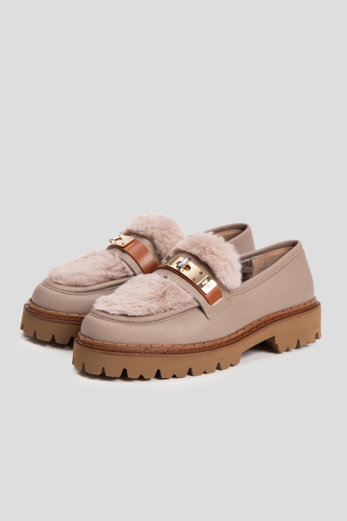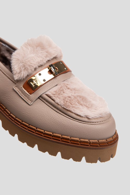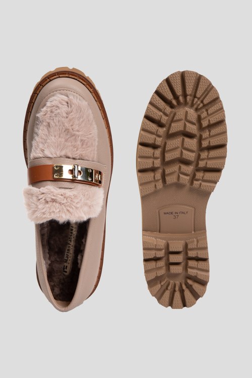 Детали: Женские бежевые кожаные лоферы на меху от Marino Fabiani (Марино Фабиани). Модель из зернистой кожи, меховая отделка, золотистая фурнитура, закругленный носок, внутри на меху. Высота каблука: 4 с, подошва: 3 см