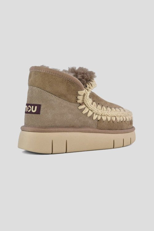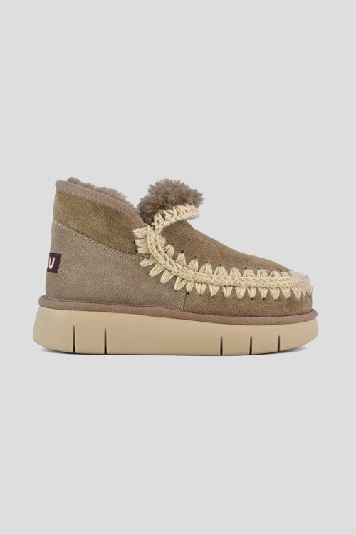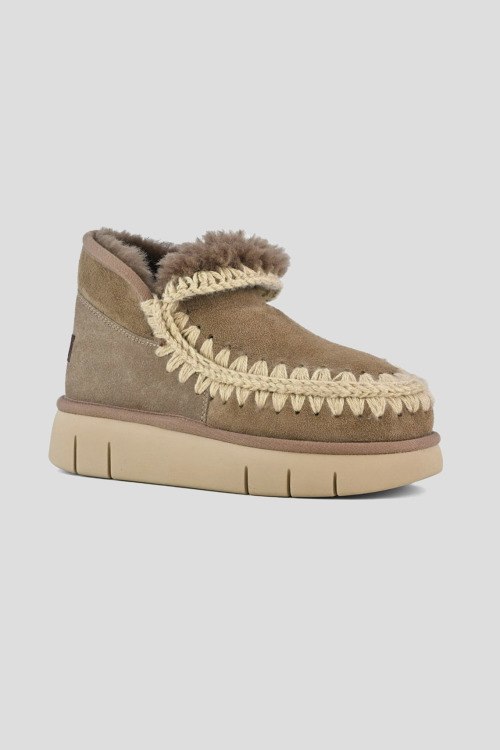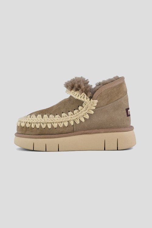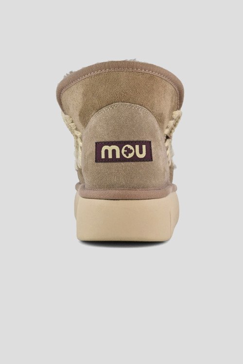 Детали: Женские бежевые замшевые ботинки на меху Eskimo от Mou (Моу). Модель без застежки, ручная вышивка, нашивка с логотипом на пятке, закругленный носок, внутри на меху