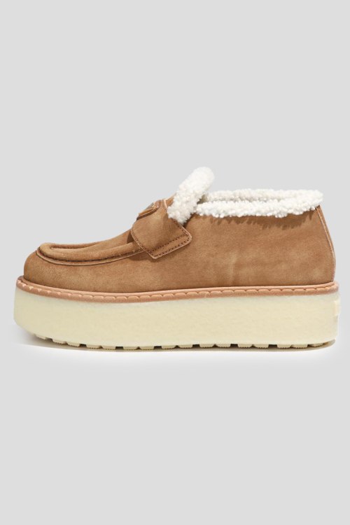 Детали: Женские бежевые замшевые лоферы на меху от Prada (Прада). Нашивка с логотипом, меховая отделка, закругленный носок, высокая подошва, внутри на меху