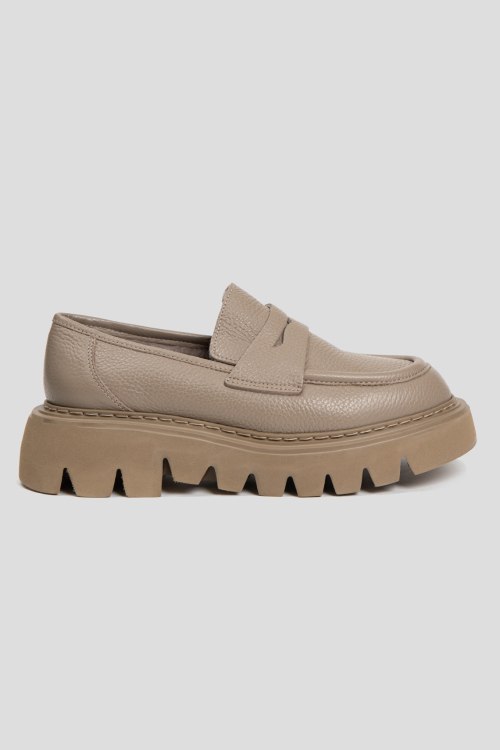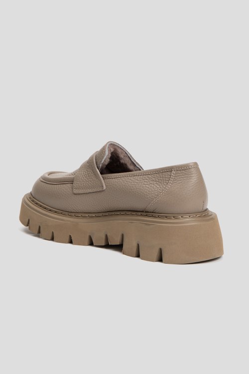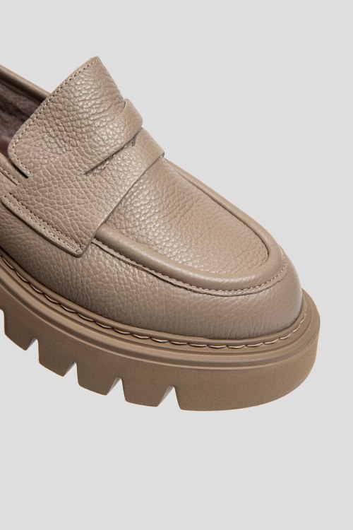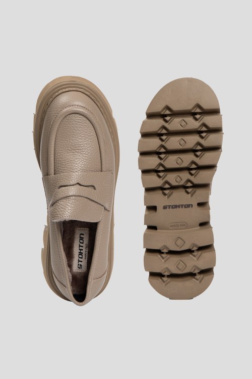 Детали: Женские бежевые кожаные лоферы на меху от Stokton (Стоктон). Модель из зернистой кожи, закругленный носок, внутри на меху. Высота каблука: 5.5 см, платформа: 4 см