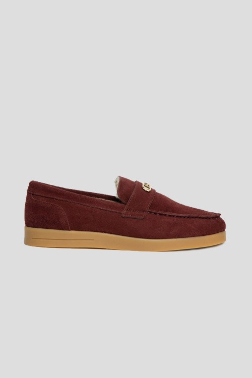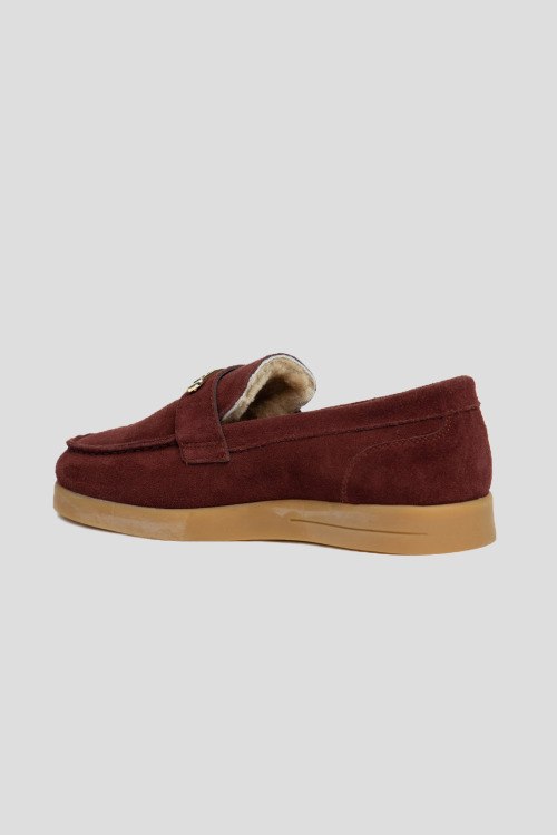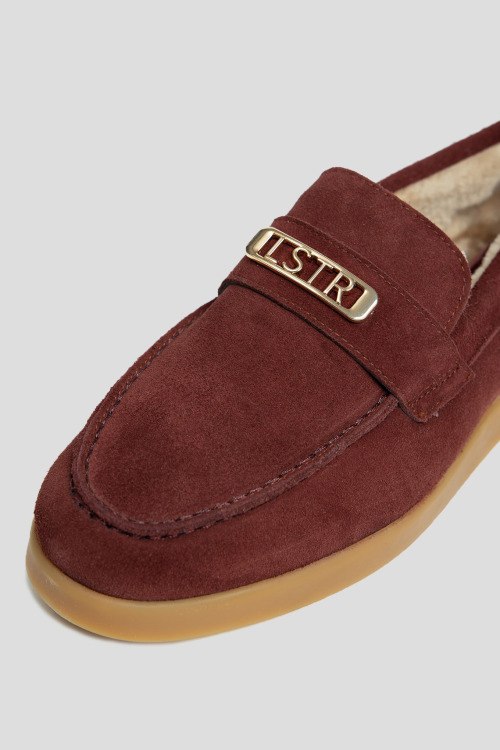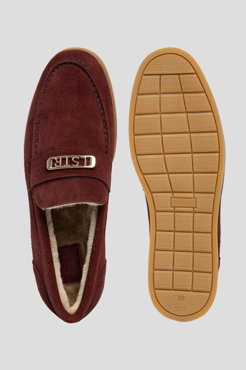 Детали: Женские бордовые лоферы из натуральной замши от L'Estrosa (Лестроса). Миндалевидный носок, модель утепленная натуральным мехом, металлическая пряжка золотистого цвета