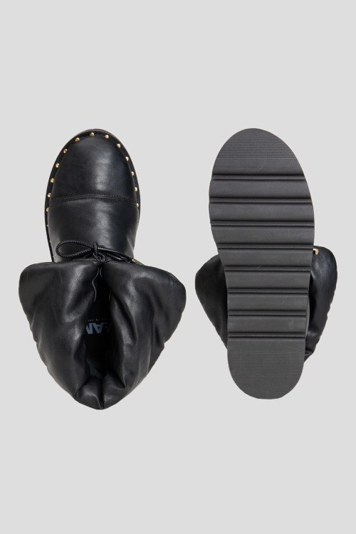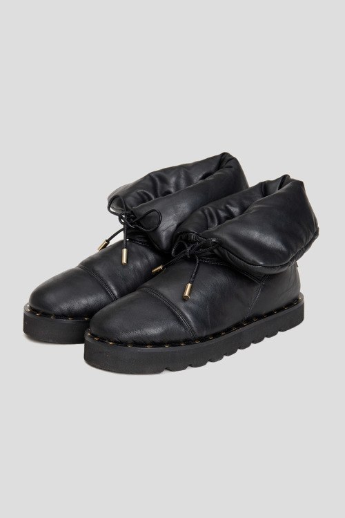 Женские черные ботинки из натуральной кожи от 7AM (Севен эй эм). Стеганый дизайн, закругленный носок, шнуровка в тон изделия, отворот на щиколотке, внутри кожаная стелька, резиновая рельефная подошва черного цвета, патч-лого на заднике