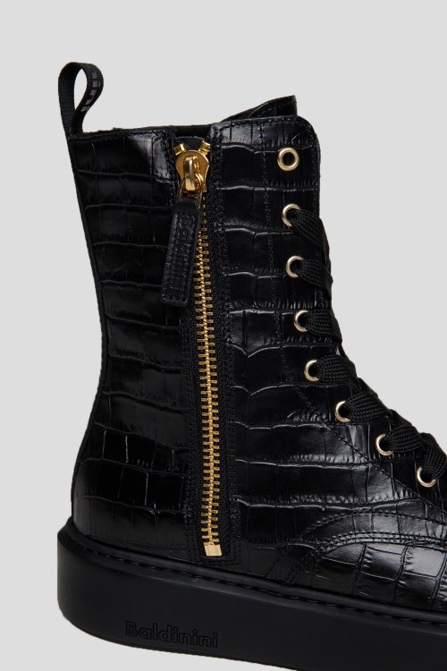 Детали: Женские черные ботинки из натуральной кожи от Baldinini (Балдинини). Закругленный носок, дизайн с тиснением под змеиную кожу, спереди классическая шнуровка, с внешней стороны застежка на молнию золотистого цвета, петля для подтягивания, модель утепленная мехом, резиновая подошва. Высота голенища: 17 см