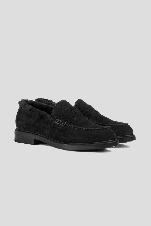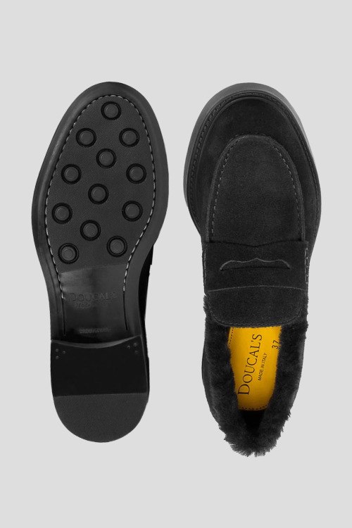 Детали: Женские черные замшевые лоферы на меху от Doucal's (Дукалс). Меховая отделка, закругленный носок, внутри на меху
