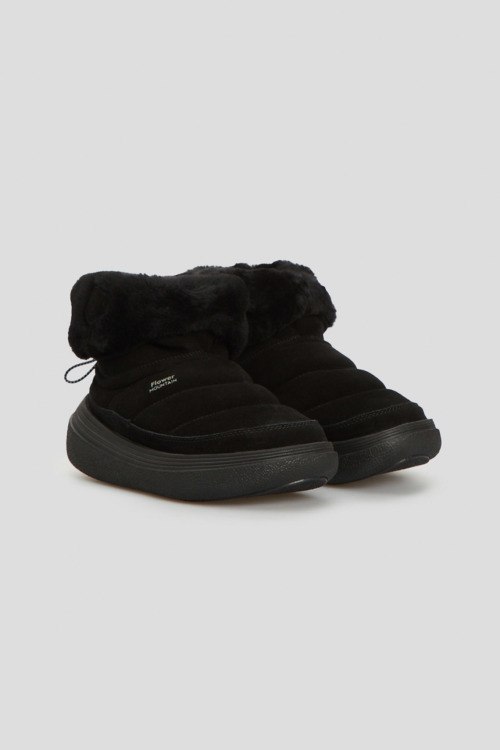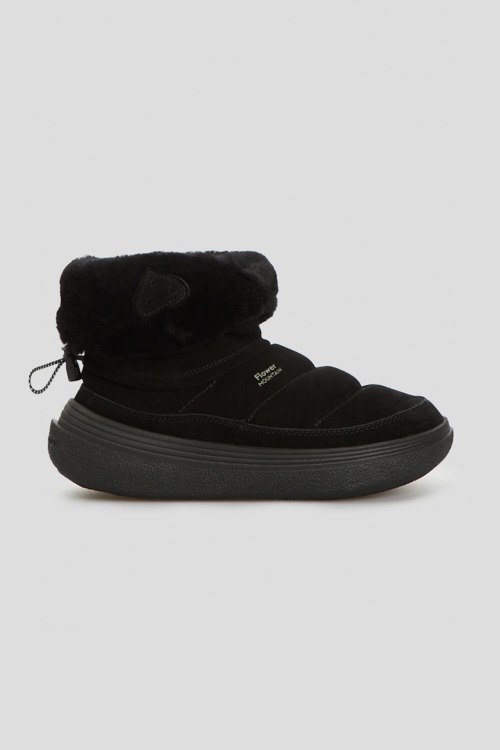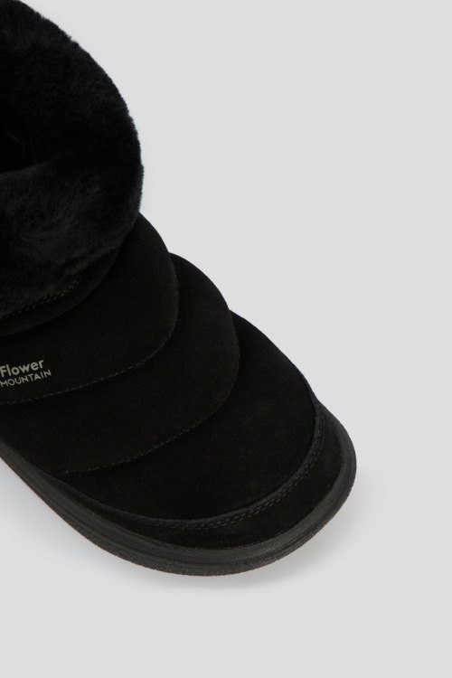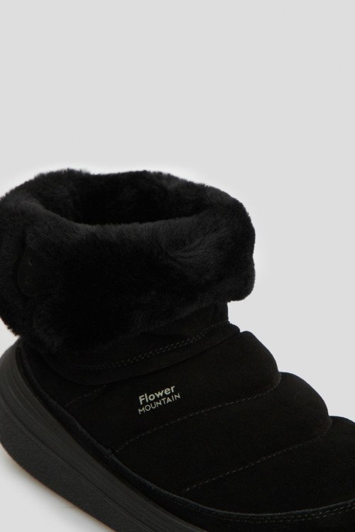 Детали: Женские черные замшевые ботинки на меху от Flower Mountain (Флауэр Маунтин). Стеганый дизайн, принт с логотипом, меховая отделка, закругленный носок, внутри на меху. Высота подошвы: 4,5 см