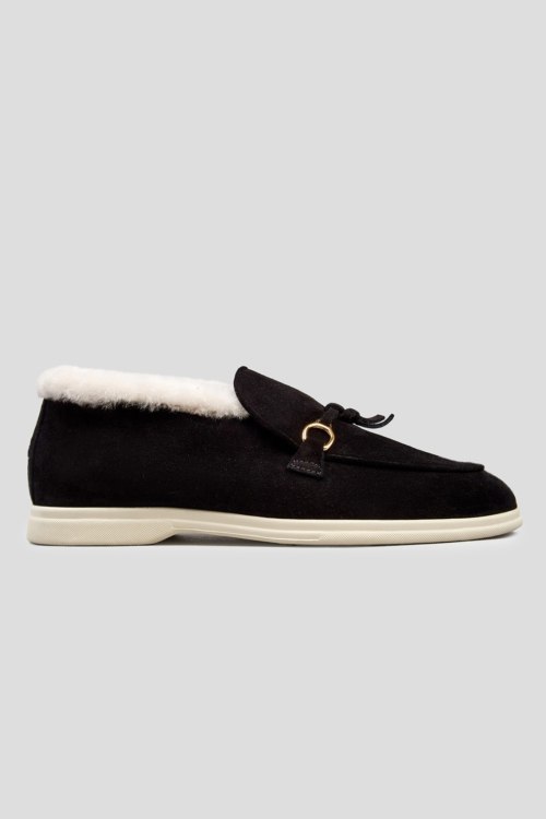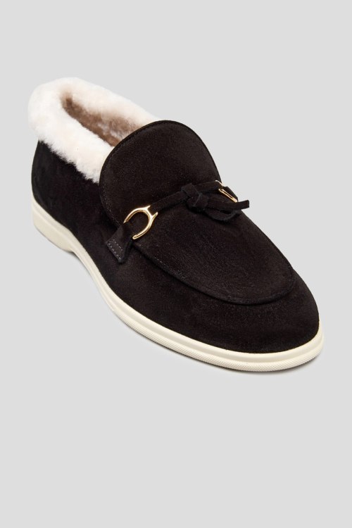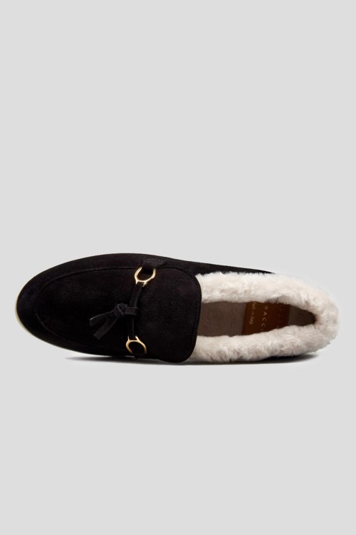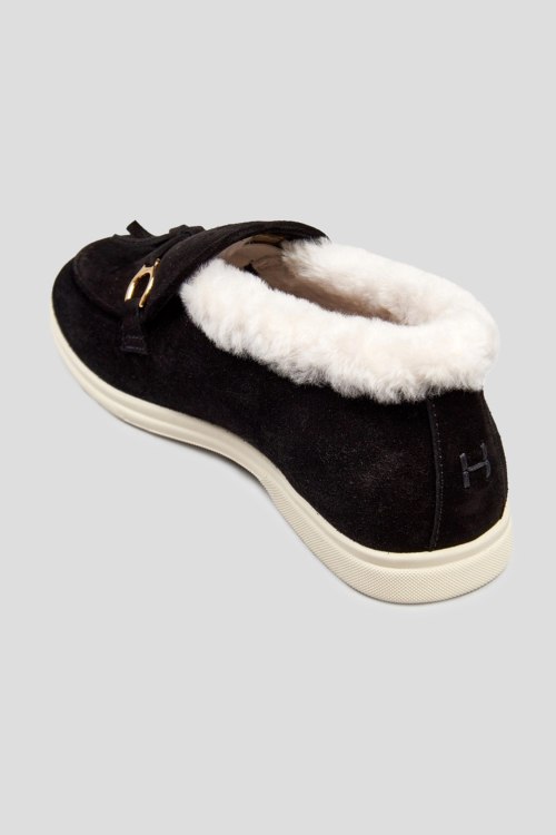 Женские черные замшевые лоферы на меху от Henderson Baracco (Хендерсон Баракко). Золотистая фурнитура, декор кисточками, меховая отделка, миндалевидный носок, внутри на меху. Высота каблука: 2 см.