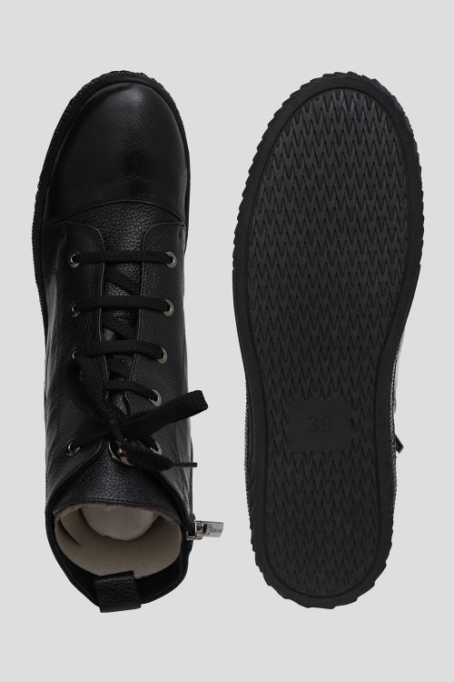 Детали: Женские черные ботинки из натуральной кожи от Ilasio Renzoni (Илазио Ренцони). Утепленная модель на меху, нашивка с логотипом на язычке, застежка-молния сбоку, классическая шнуровка, подошва декорирована стразами и тиснением под кожу змеи