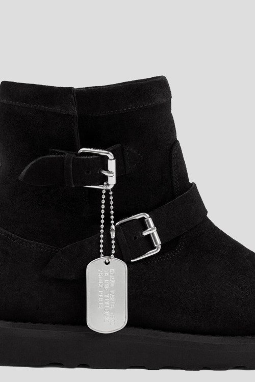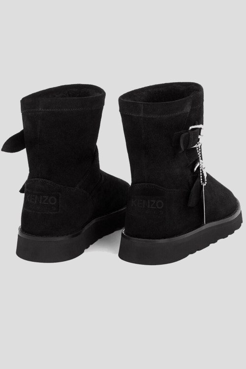 Женские черные угги из замша от Kenzo (Кензо). Закругленный носок, модель утепленная овчиной, без застежки, регулируемые ремешки сбоку, рельефная подошва, брендированный съемный брелок