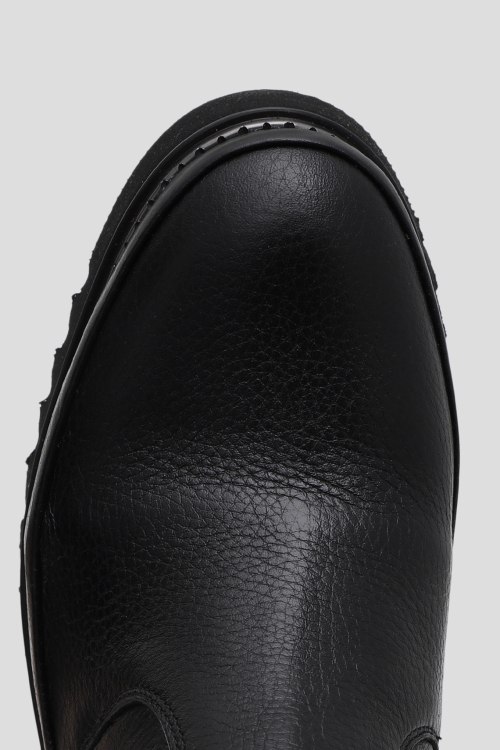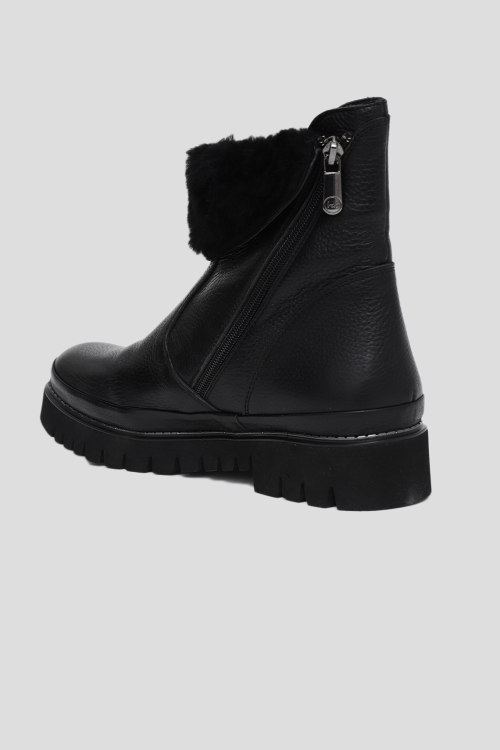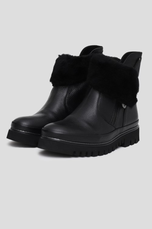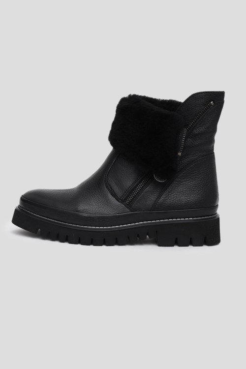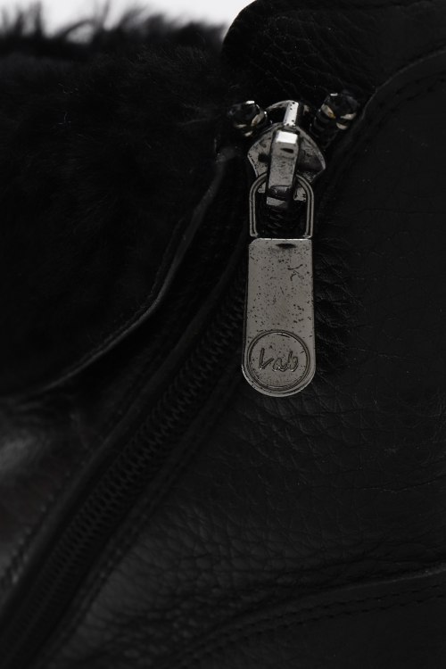 Детали: Женские черные ботинки из натуральной кожи от Lab Milano (Лаб Милано). Миндалевидный носок, рельефная подошва декорирована металлической фурнитурой, с двух сторон застегиваются на застежку молнию, спереди меховой отворот, утеплитель из натурального меха