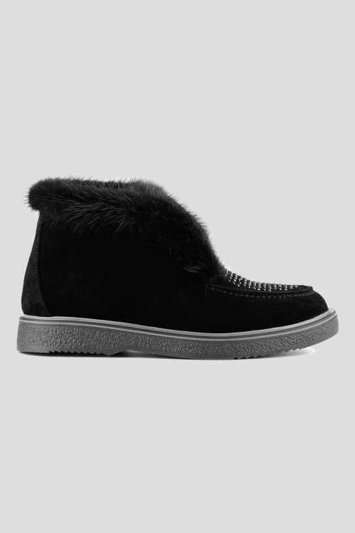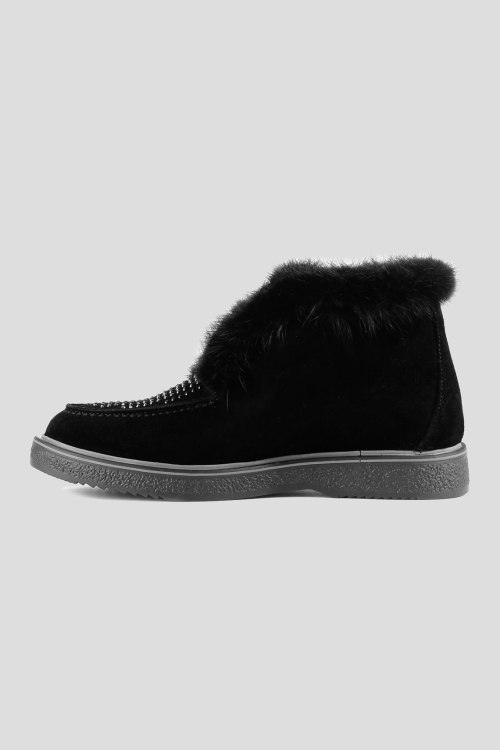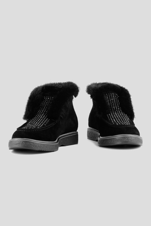 Детали: Женские черные лоферы из натуральной замши от Le Berdes (Ле Бердес). Миндалевидный носок, спереди декорированы кристаллами, утеплены мехом, стелька из байки. Измерения: высота платформы: 2 см
