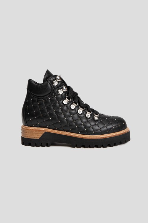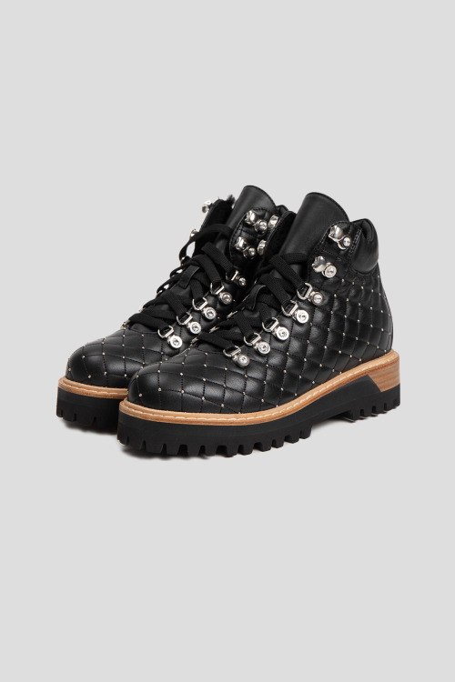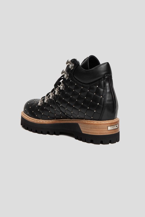 Детали: Женские черные кожаные ботинки на меху St. Moritz от Le Silla (Ле Силла). Модель из гладкой кожи, стеганый дизайн, декор заклепками, классическая шнуровка, закругленный носок, внутри на меху. Высота каблука: 3.5 см, подошва: 2.5 см, высота голенища: 11.5 см