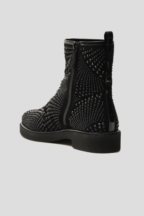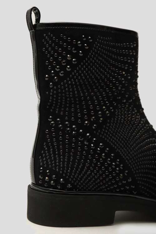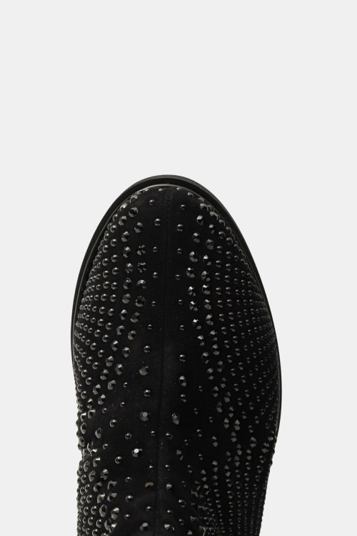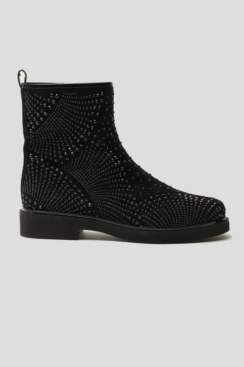 Детали: Женские черные ботинки из натуральной замши от Loriblu (Лориблу). Миндалевидный носок, широкий низкий каблук, застегиваются на молнию, петли для подтягивания, декор в виде металлический заклепок в тои изделия. Измерения: высота голенища: 15,5 см